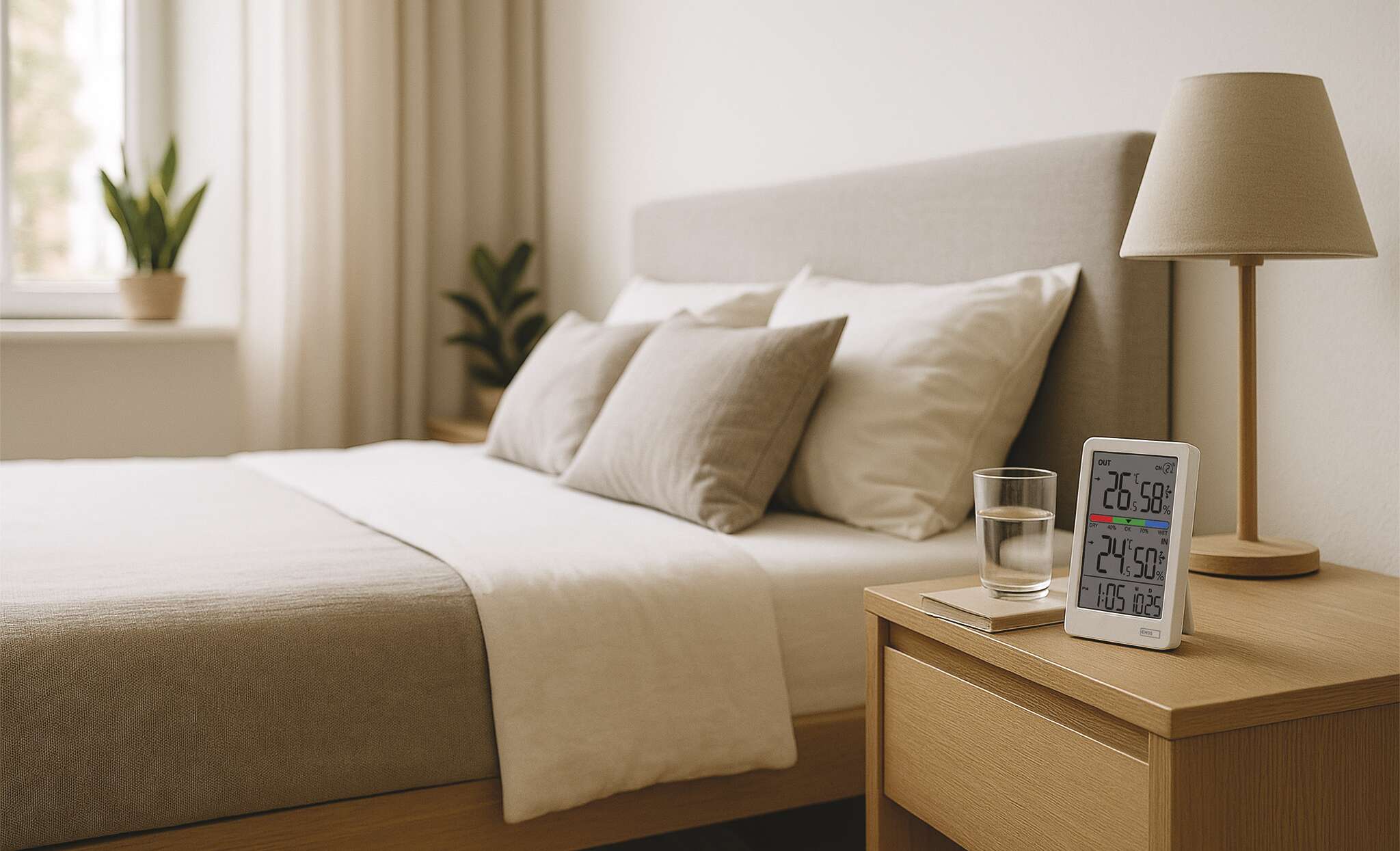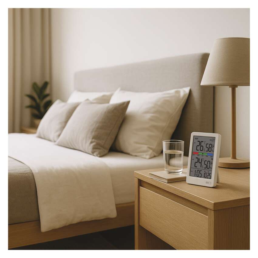 See kaasaegne juhtmeta termomeeter näitab hõlpsasti sisutemperatuuri ja välistemperatuuri 0,1 °C eraldusvõimega, näitab sisutemperatuuri ja välisõhu niiskust vahemikus 1% kuni 99% RH ning pakub temperatuuritrendi või kolmetasandilist mugavusnäitajat. Välistemperatuuri aitab mõõta juhtmeta andur, mida saab paigutada kuni 100 m kaugusele termomeetrist vabas ruumis.