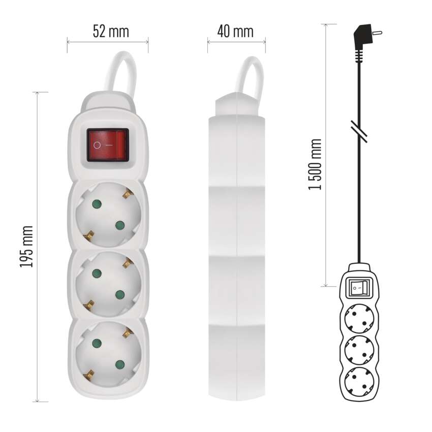 Pikendusjuhe 1,5 m / 3 Pistikupesa / koos lülitiga / valge / PVC / 1,5 mm2