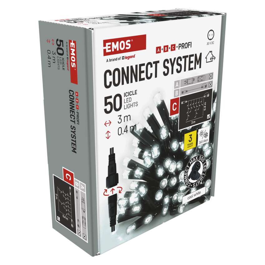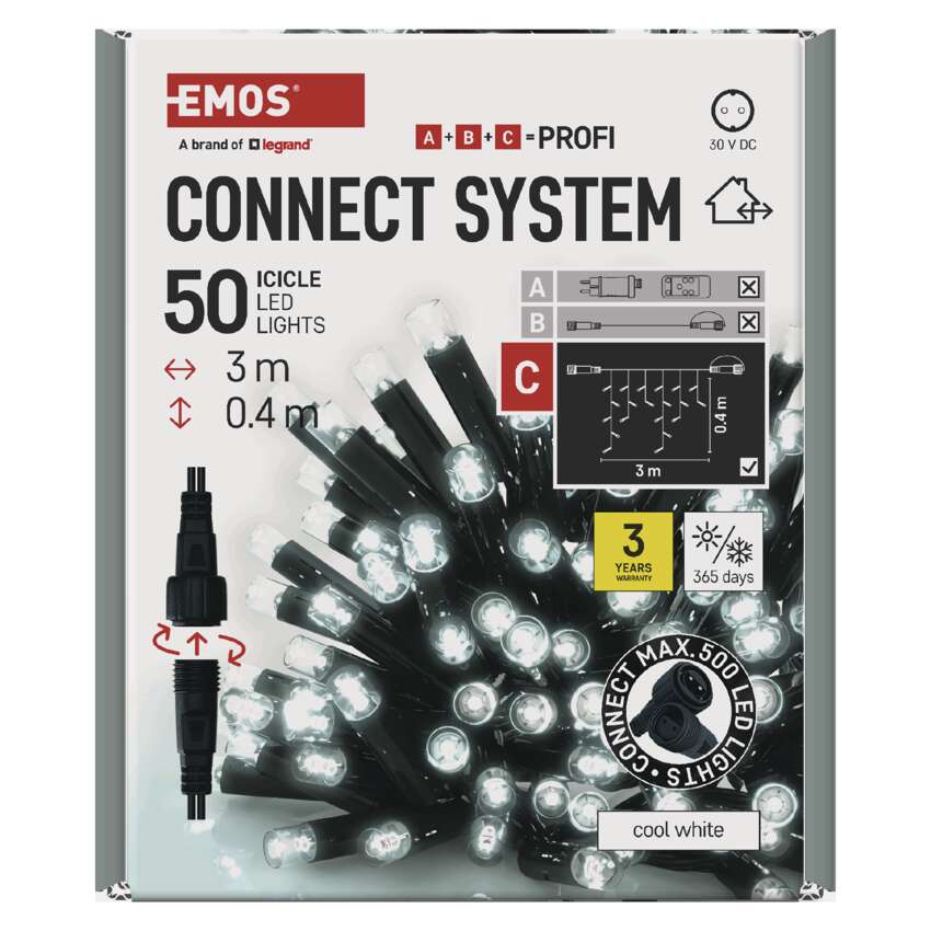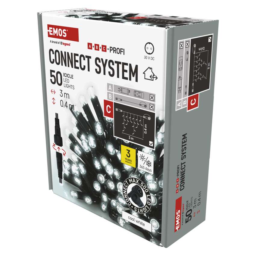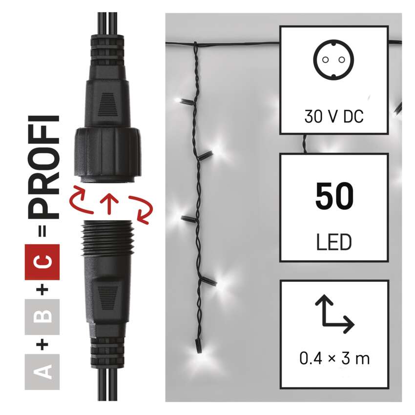 Ülekandesüsteem CONNECT SYSTEM PROFI sobib tänu IP44 klassifikatsioonile nii sise- kui ka välitingimustes kasutamiseks. Seda iseloomustab suurem materjalikindlus ja pikendatud 3-aastane garantii. Kvaliteetsed kummist kaablid võimaldavad aastaringset paigaldamist ilma demonteerimise vajaduseta mis tahes temperatuuritingimustes. Valige standardkettide, stalaktite ja klastrite vahel. Ühest toiteallikast(A), mis on ühendatud pikenduskaablite, jaoturite(B) ja LED-valguselemendid(C) saavad toidet juba 500 LED-valgustile.