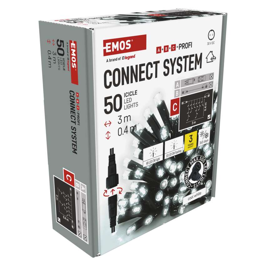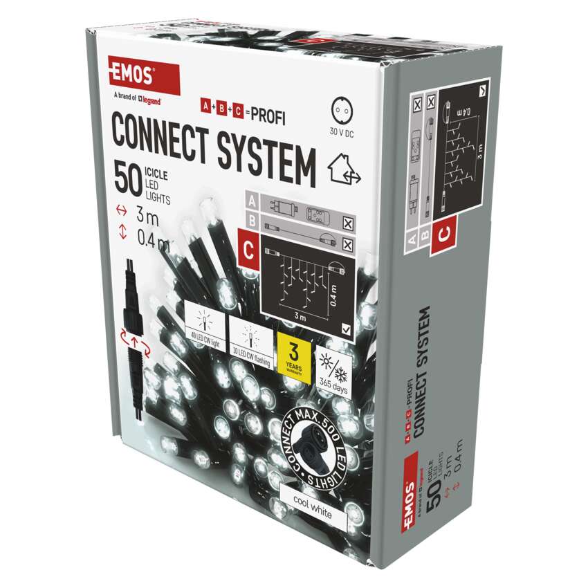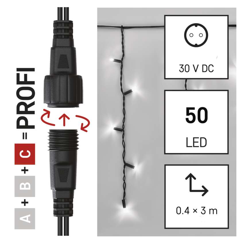 Ühendussüsteem CONNECT SYSTEM PROFI sobib tänu IP44 klassifikatsioonile kasutamiseks nii sise- kui ka välistingimustes. Seda iseloomustab suurem materjalikindlus ja pikendatud 3-aastane garantii. Kvaliteetsed kummist kaablid võimaldavad aastaringset paigaldamist ilma demonteerimise vajaduseta mis tahes temperatuuritingimustes. Valige standardkettide, stalaktite ja klastrite vahel. Ühest toiteallikast(A), mis on ühendatud pikenduskaablite, jaoturite(B) ja LED-valguselemendid(C) saavad toidet juba 500 LED-valgustile.