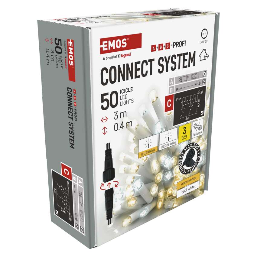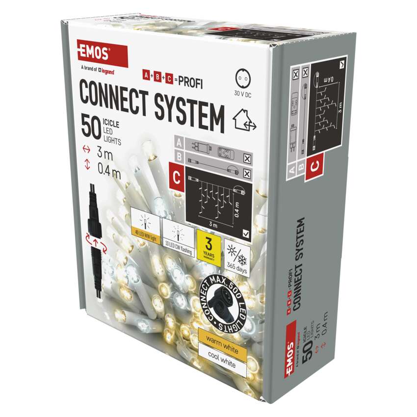Ühendussüsteem CONNECT SYSTEM PROFI sobib tänu IP44 klassifikatsioonile kasutamiseks nii sise- kui ka välistingimustes. Seda iseloomustab suurem materjalikindlus ja pikendatud 3-aastane garantii. Kvaliteetsed kummist kaablid võimaldavad aastaringset paigaldamist ilma demonteerimise vajaduseta mis tahes temperatuuritingimustes. Valige standardkettide, stalaktite ja klastrite vahel. Ühest toiteallikast(A), mis on ühendatud pikenduskaablite, jaoturite(B) ja LED-valguselemendid(C) saavad toidet juba 500 LED-valgustile.